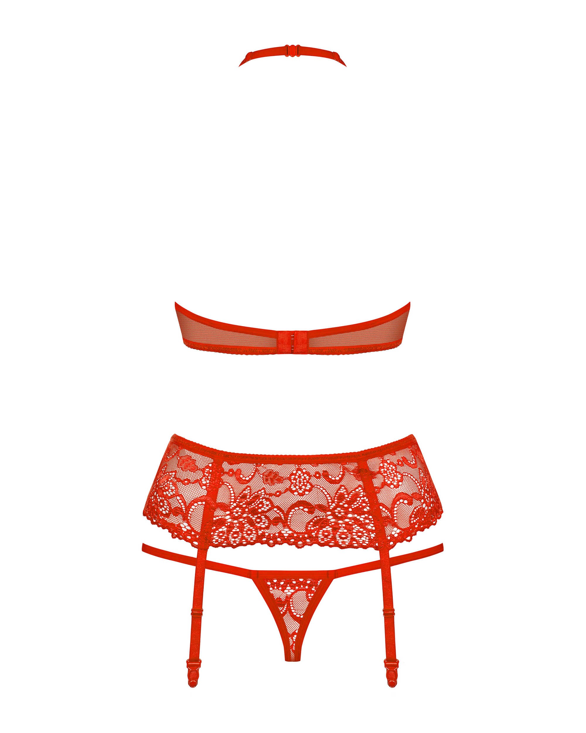 À la recherche de l’attirail parfait pour la Saint-Valentin ? Cet ensemble 3 pièces rouge de la collection Obsessive 838 est parfait pour exprimer votre passion et surprendre votre partenaire. Composé d’un soutien-gorge, d’un string et d’un porte-jarretelles, ce modèle révèle le sex-appeal de toute femme qui le porte. Conçu en maille et fine dentelle, cet ensemble est orné de lanières et d’un bijou de charme qui subliment le décolleté. Composition : 90% polyamide et 10% élasthanne