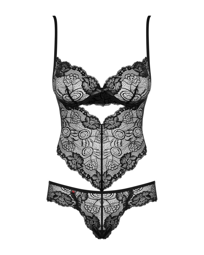 Un délice pour les yeux et pour celle qui le portera. Un body noir sexy en dentelle avec une coupe très originale. Mise en valeur de la poitrine avec des bonnets à armatures et des bretelles réglables. Une coupe triangulaire qui donne un effet amincissant et qui vient rejoindre la partie string. Fermeture dans le dos avec un laçage façon corset et qui donne un look ensemble sexy. La dentelle est à motif florale et la composition est 90% polyamide et 10% elasthanne.Découvrir toute la collection de lingerie sexy Alluria Obsessive