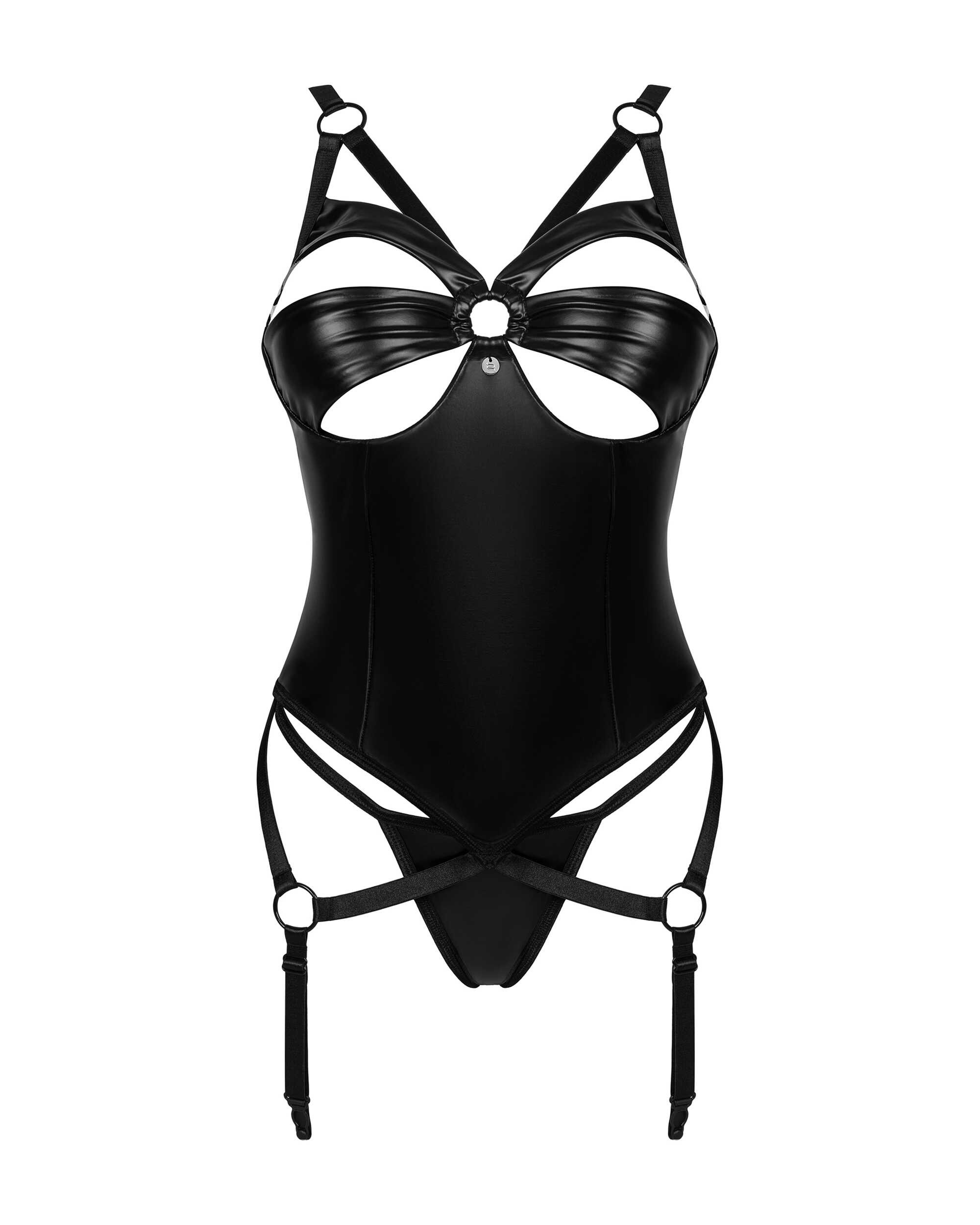 Vous êtes enthousiaste à l’idée d’une soirée romantique à venir ? Vous avez envie de briser les schémas et de vous présenter sous une toute nouvelle forme ? Réchauffez l’atmosphère avec une combinaison incroyablement sensuelle de noir intense et de détails métalliques. Surprenez-vous et préparez-vous à recevoir une avalanche de compliments. Découvrez plus de détails :- corset et string noirs- un ajustement parfait grâce à la fermeture en plusieurs étapes et aux jarretelles et bretelles réglables – pendentif intéressant – un accessoire chic – matière élastique brillante et douce au toucher 100% polyuréthane ; doublure : 95% viscose, 5% élasthanne