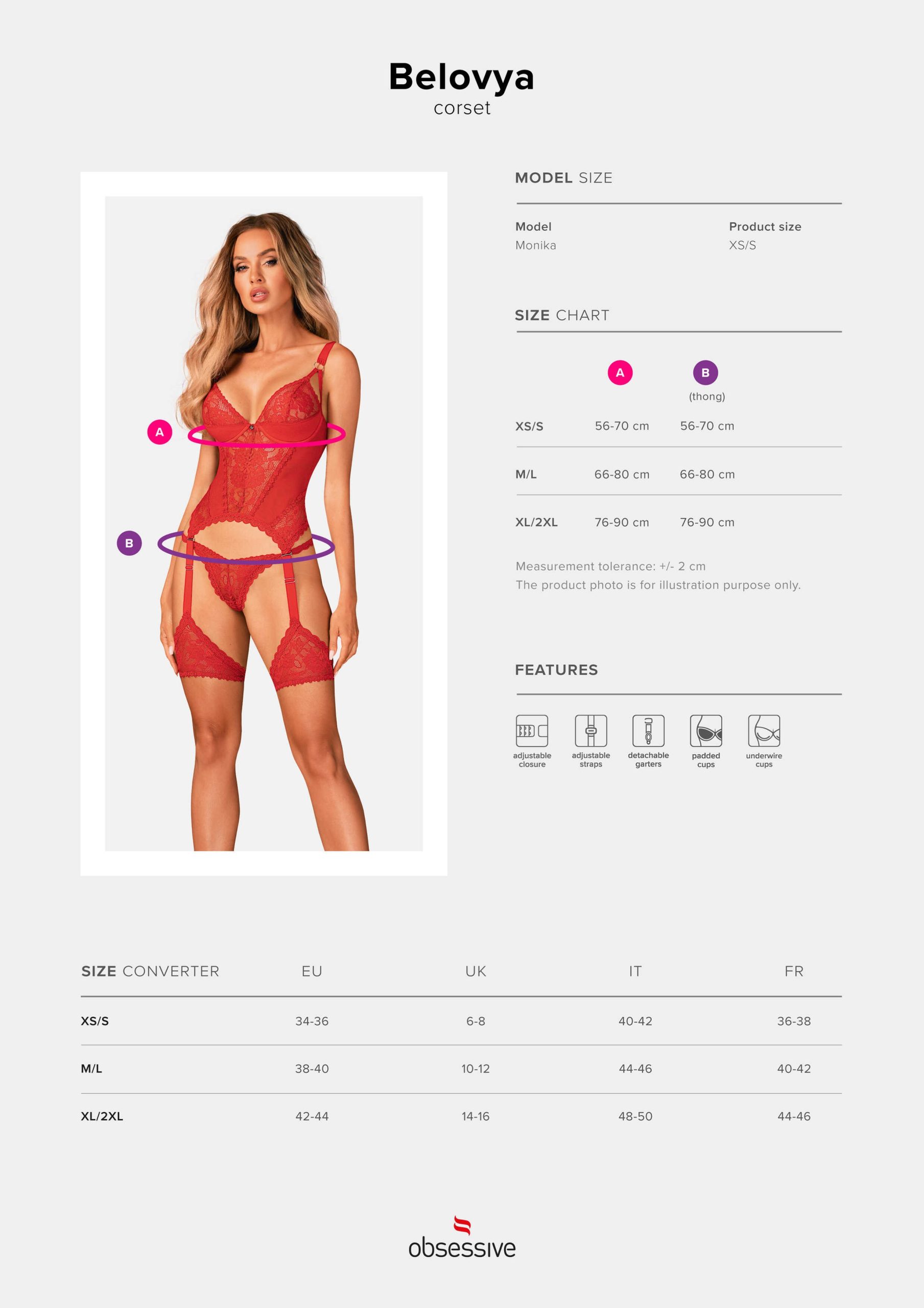 Corset Belovya avec jarretelles Les moments épicés à deux deviendront désormais encore plus agréables ! Découvrez le corset Belovya incroyablement sexy, qui séduit par sa couleur juteuse et impressionne par sa coupe unique. Optez pour ce modèle sensuel avec jarretelles et faites monter au maximum la température de délicieuses nuits ! Sensations chaudes ? c’est l’heure, c’est parti ! Découvrez plus de détails :- Corset rouge Belovya- dentelle classique et élégante – ajoute du style- maille agréable au toucher – formes sensuellement soulignées- soutien-gorge à armatures – buste magnifiquement exposé- larges bretelles décorées d’anneaux bijoux – bel aspect des seins- bretelles réglables – confort et commodité- fermeture par crochets au dos – ajustement parfait- des jarretelles amovibles à bretelles réglables, sur le devant et dans le dos, sur les cuisses – un élément tentateur- matériaux agréables et souples