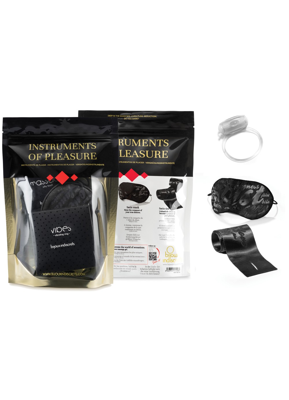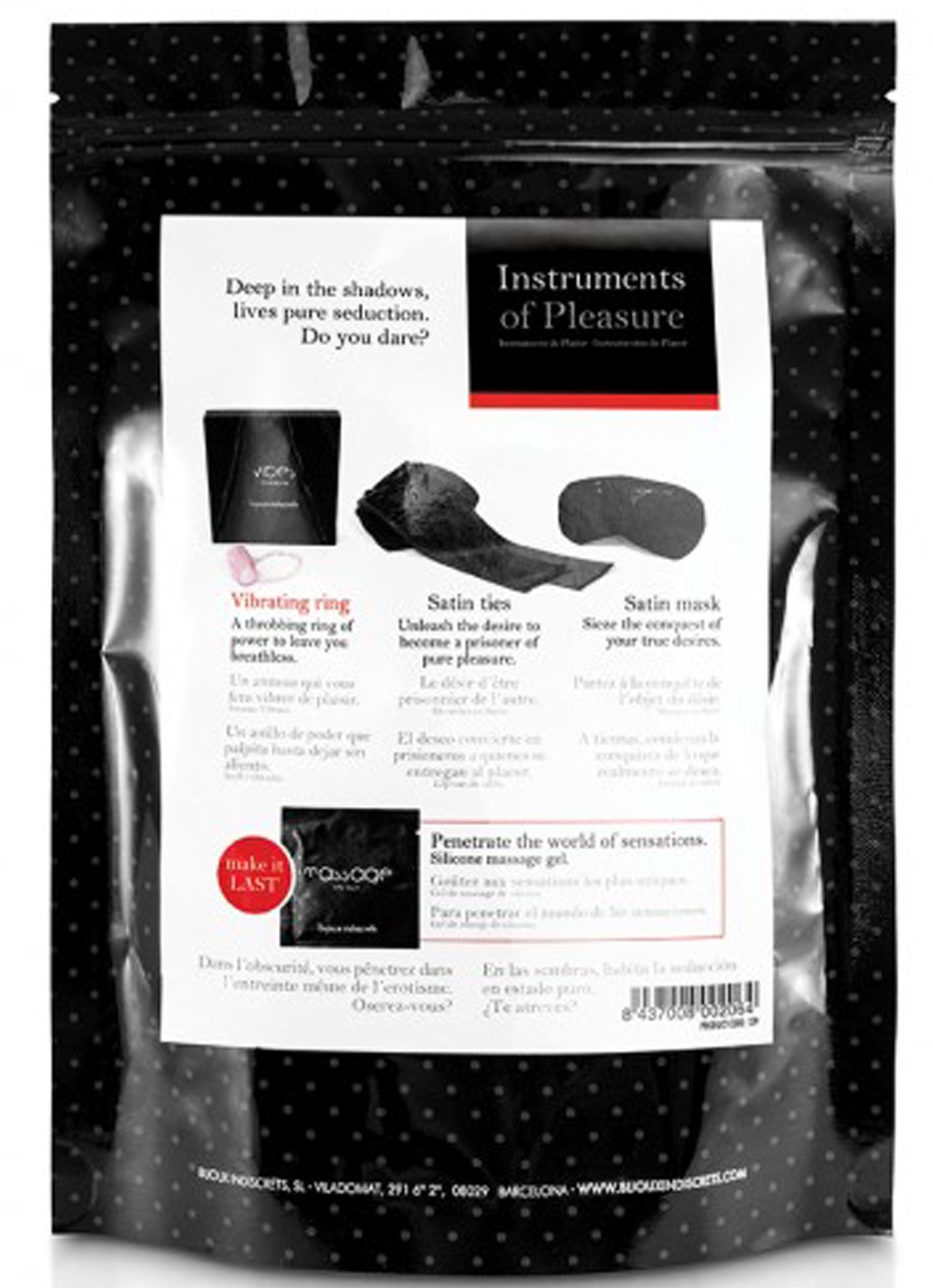 Petit coffret bien sympathique pour vos moments de plaisirs. Cet ensemble coquin contient un masque satiné, des menottes satinés, un cockring vibrant et une dosette d’huile de massage. Avec ce kit de plaisir vous voilà paré pour passer des nuits très agitées.