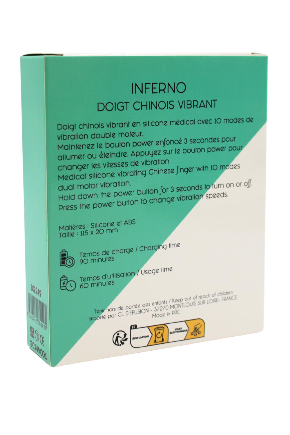 Le Doigt Vibrant INFERNO transforme chaque caresse en une explosion de sensations. Grâce à ses 2 moteurs intégrés et ses 10 modes de vibration, il permet une stimulation intense et ciblée, aussi bien en solo qu?à deux. Son design en forme de harnais en silicone souple s?adapte parfaitement à la main, assurant une bonne prise et un confort optimal pendant l?utilisation.Conçu en silicone médical doux et hygiénique, il est résistant à l?eau, rechargeable par câble magnétique USB, et fonctionne en toute autonomie pendant environ 60 minutes après 90 minutes de charge.Très simple d’utilisation : 1 seul bouton pour tout contrôler ? appuyez 2 secondes pour allumer/éteindre, puis appuyez pour changer les modes.Poids : 83 gBatterie : Lithium-ionCharge magnétiqueAutonomie : 60 min ? Charge : 90 minRésistant à l?eau