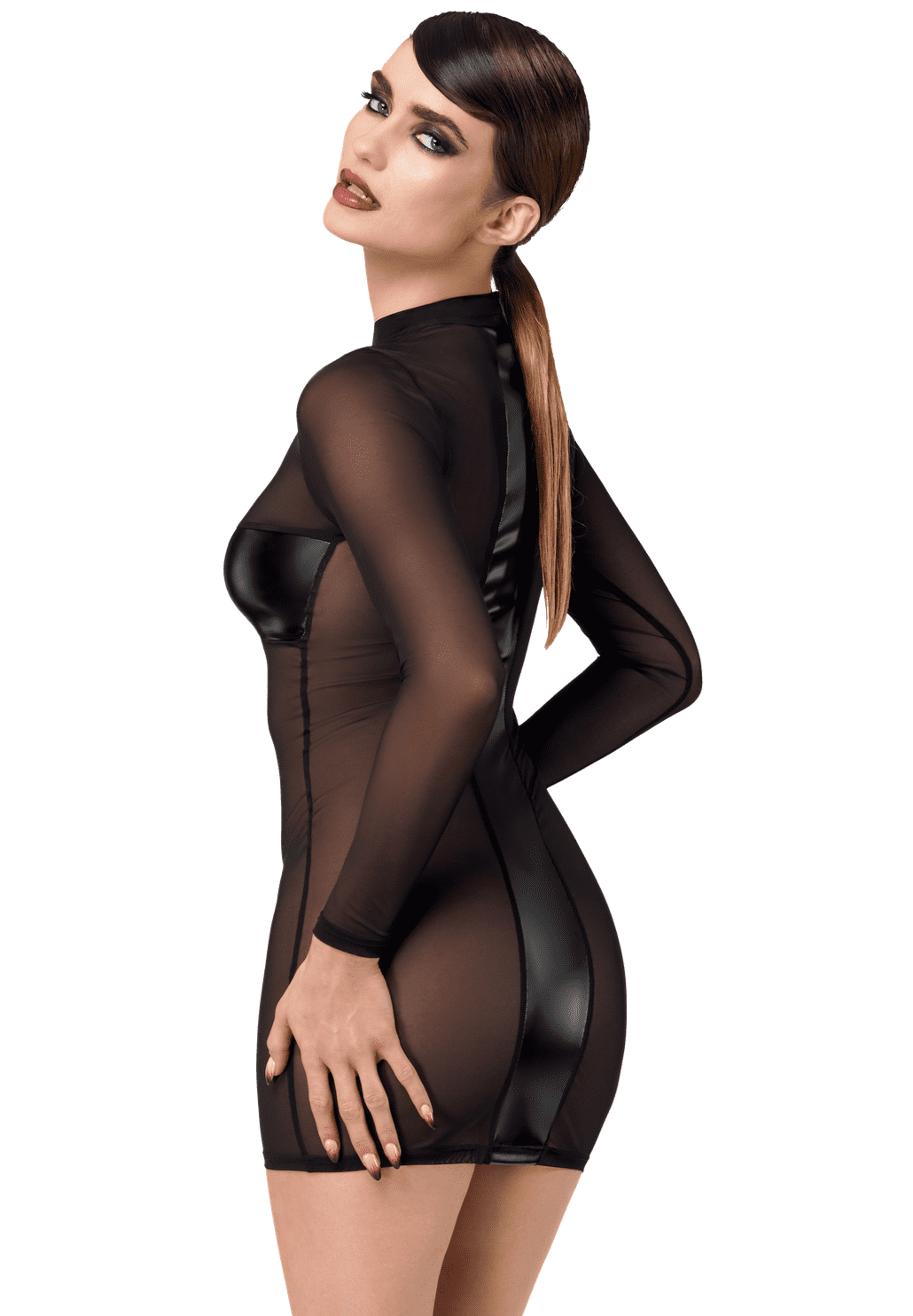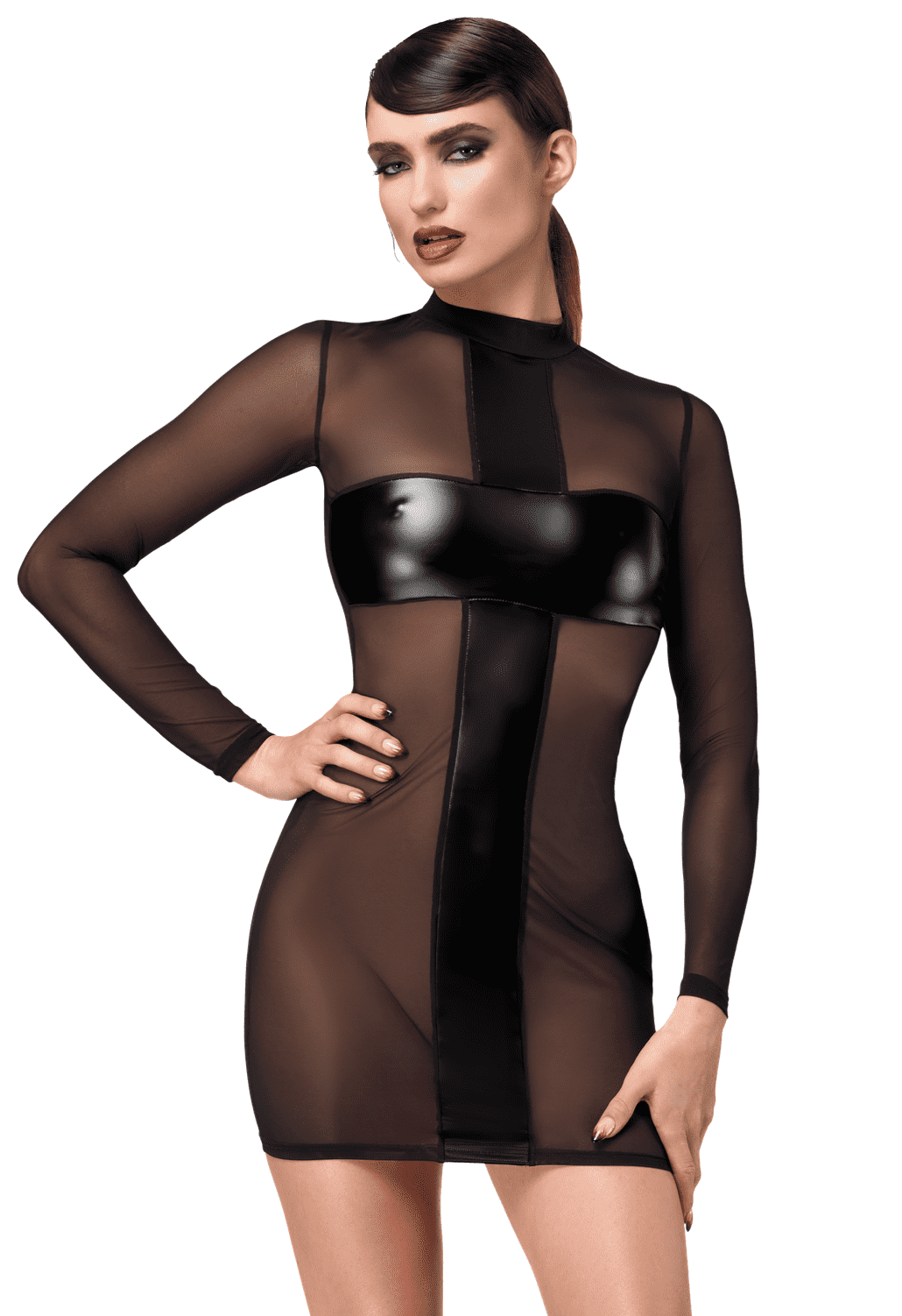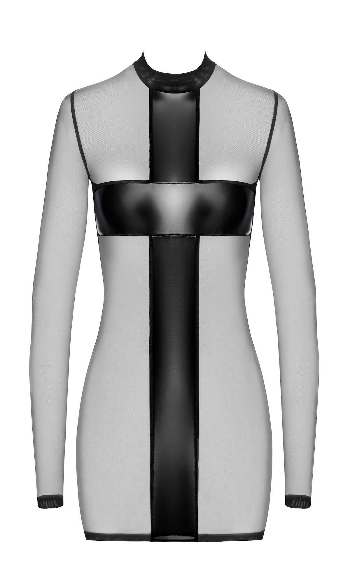 Une robe en tulle doux avec des panneaux powerwetlook croisés qui couvrent les zones intimes. C?est un style de pull-over avec une bande de power wetlook pleine longueur qui descend le long du dos.93% polyamide, 7% elasthan