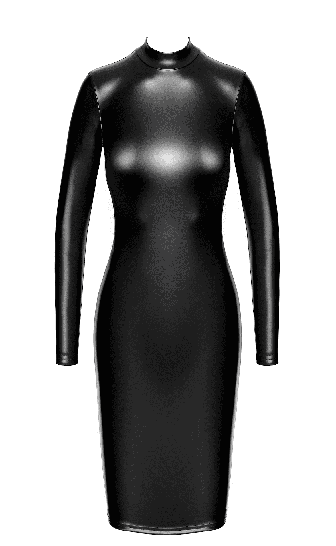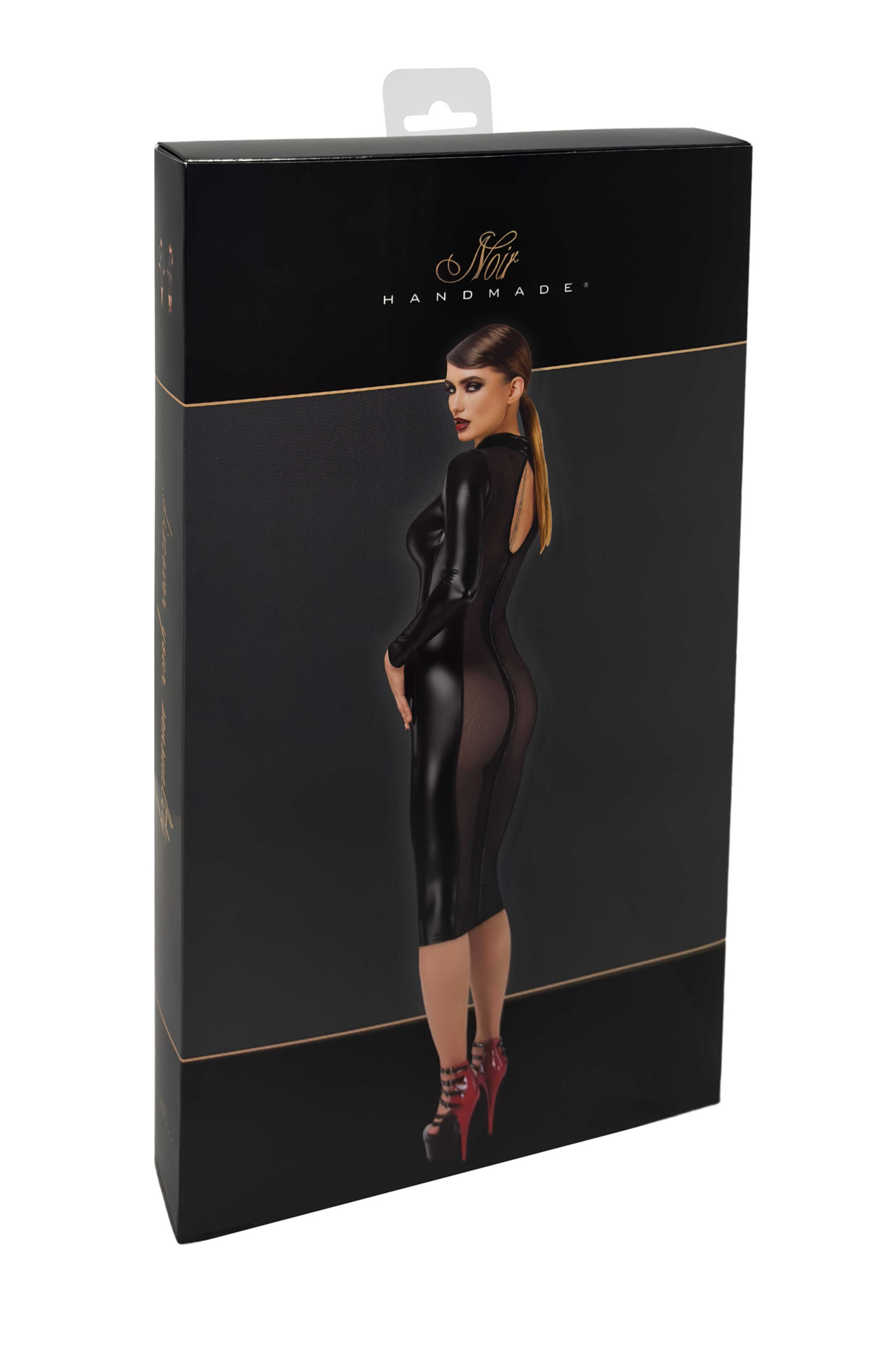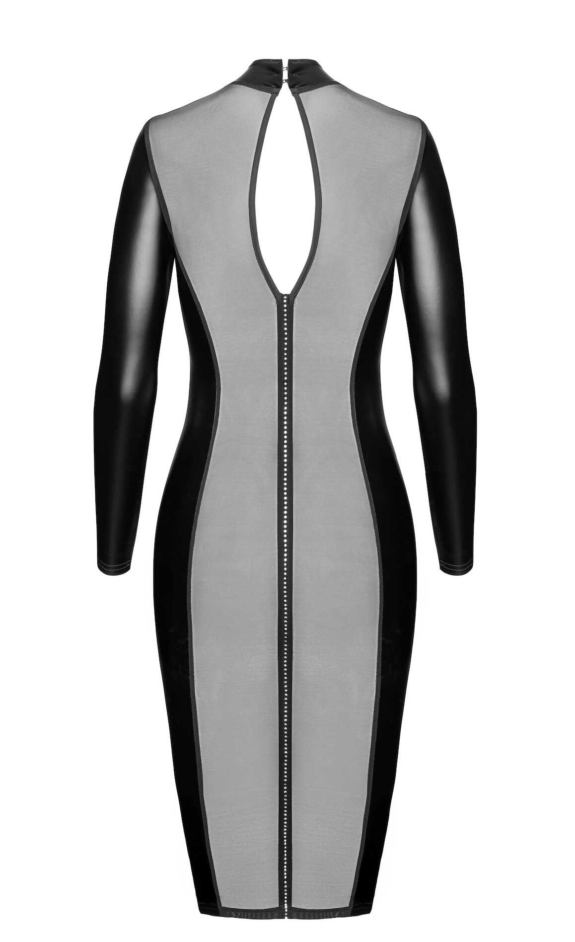 Une robe midi élégante en power wetlook et tulle. Le devant simple et lisse contraste avec le dos transparent, qui est décoré d?un ruban en strass au centre. La robe présente des manches longues et un col montant fermé par des crochets.76% polyester, 24% elasthan, Polimer coating; Net: 93% polyamide, 7% elasthan