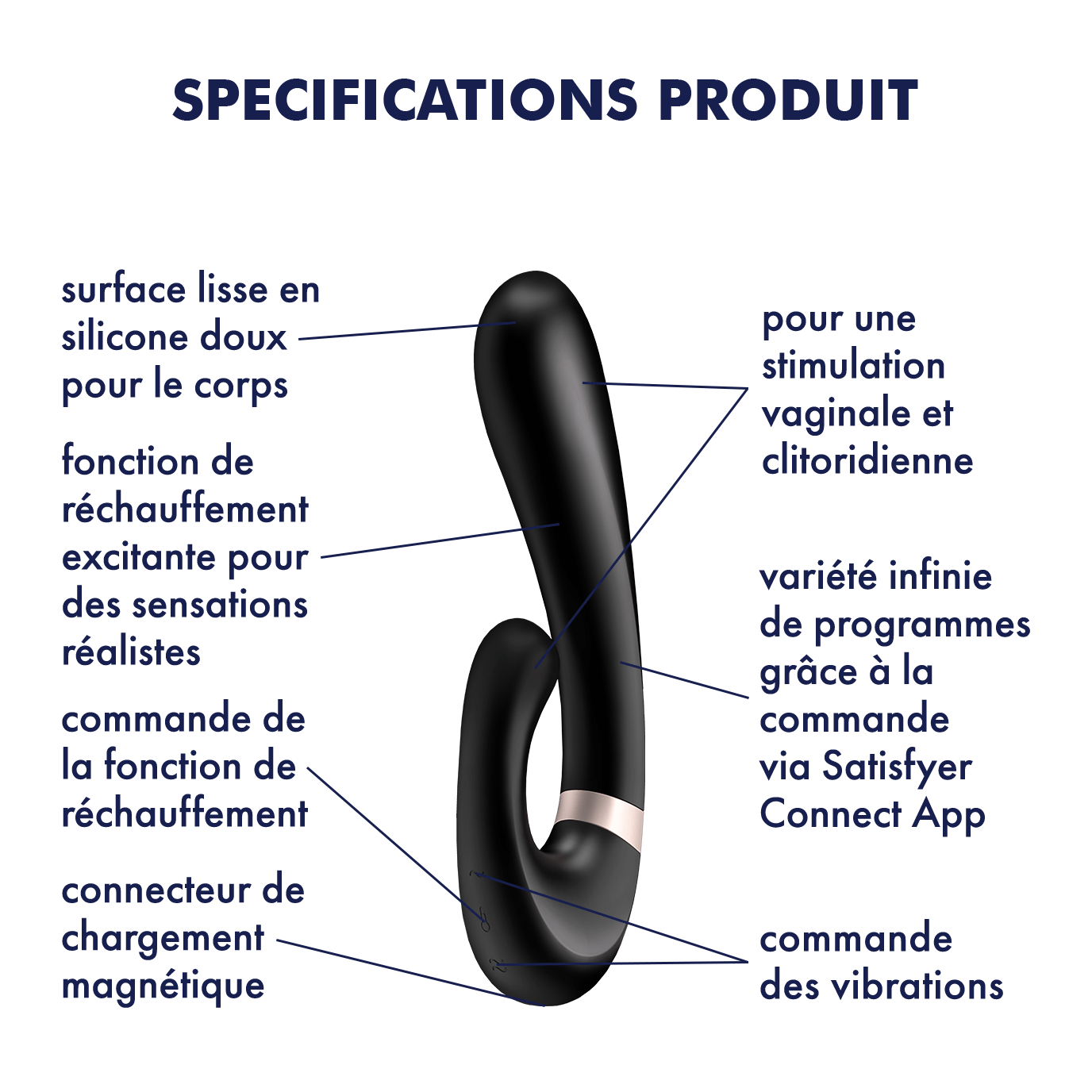 Satisfyer Heat Wave Connect App – Noir : Doublez le plaisir avec les ondes de pression et le massage du point G Notre lapin a reçu une évolution dans le Satisfyer Heat Wave Connect App : Ce vibromasseur s’adapte à vos contours pour vous procurer un plaisir unique. Alors que la tige élégamment incurvée masse votre point G avec des vibrations pénétrantes, les ondes de pression de l’extérieur assurent une stimulation clitoridienne profonde. Grâce à la technologie silicone flex et à un joint de chaîne à l’intérieur, vous pouvez facilement régler le Satisfyer Heat Wave Connect App pour que votre vibromasseur à ondes de pression touche parfaitement votre point chaud et transmette ses vibrations de manière particulièrement intense. La poignée est également suffisamment large pour vous assurer de ne pas perdre votre prise. Les deux moteurs puissants peuvent également être contrôlés indépendamment l’un de l’autre, tandis que 10 programmes de vibration différents et 11 intensités offrent d’innombrables possibilités de combinaison et des plaisirs variés. Satisfyer Heat Wave Connect App – Mauve : Autres bienfaits du Rabbit Le Satisfyer Heat Wave Connect App – Noir est fabriqué à partir de silicone de qualité médicale, il caresse donc délicatement vos zones érogènes de l’intérieur et de l’extérieur. Sa finition étanche (IPX7) le rend également adapté à une utilisation sous la douche ou dans la baignoire, de sorte que vous puissiez toujours vous amuser lorsque les choses sont mouillées. Après utilisation, vous pouvez facilement nettoyer le vibromasseur avec de l’eau tiède et un nettoyant pour jouets. Le câble de chargement USB fourni garantit également qu’il est rapidement prêt pour des plaisirs passionnés chaque fois que vous en aurez à nouveau besoin.