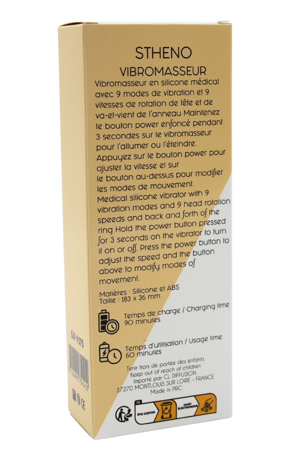 Le STHENO est un vibromasseur de nouvelle génération, conçu pour offrir une stimulation profonde et dynamique. Sa tête arrondie et nervurée permet un massage ciblé du point G, tandis que sa technologie intégrée combine rotation et glissement automatique pour une expérience inédite.Grâce à ses 9 modes de vibration et 9 modes de rotation/glissement, chaque séance devient un moment unique, entre intensité et douceur.Commandes simples :Bouton Power bas : Appui long 2s pour allumer/éteindre ? clic court pour faire défiler les vibrationsBouton Fonction haut : clic pour déclencher les modes de glissement/rotation ? appui long pour les arrêterRecharge magnétique ? 90 min de charge 45 min de plaisirDimensions : Voir image produitPoids : 148,9 gSilicone médical waterproof ? sûr, doux, et facile à nettoyer